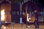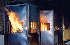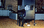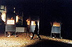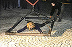 Part I Three human dummies, filled with water, were burnt in three cells of steel. The heat destroyed the dummies, and what was left of them was just water flowing down through an outlet into a box. The water which had formerly been in the dummies is now preserved in sealid glas ressels bearing the label Zell-Brennstoff Mensch - Everything remains inside, only water is coming out. A symbol of human existence. Specially composed techno-tracks formed a convenient backround to the three parts of the performance.